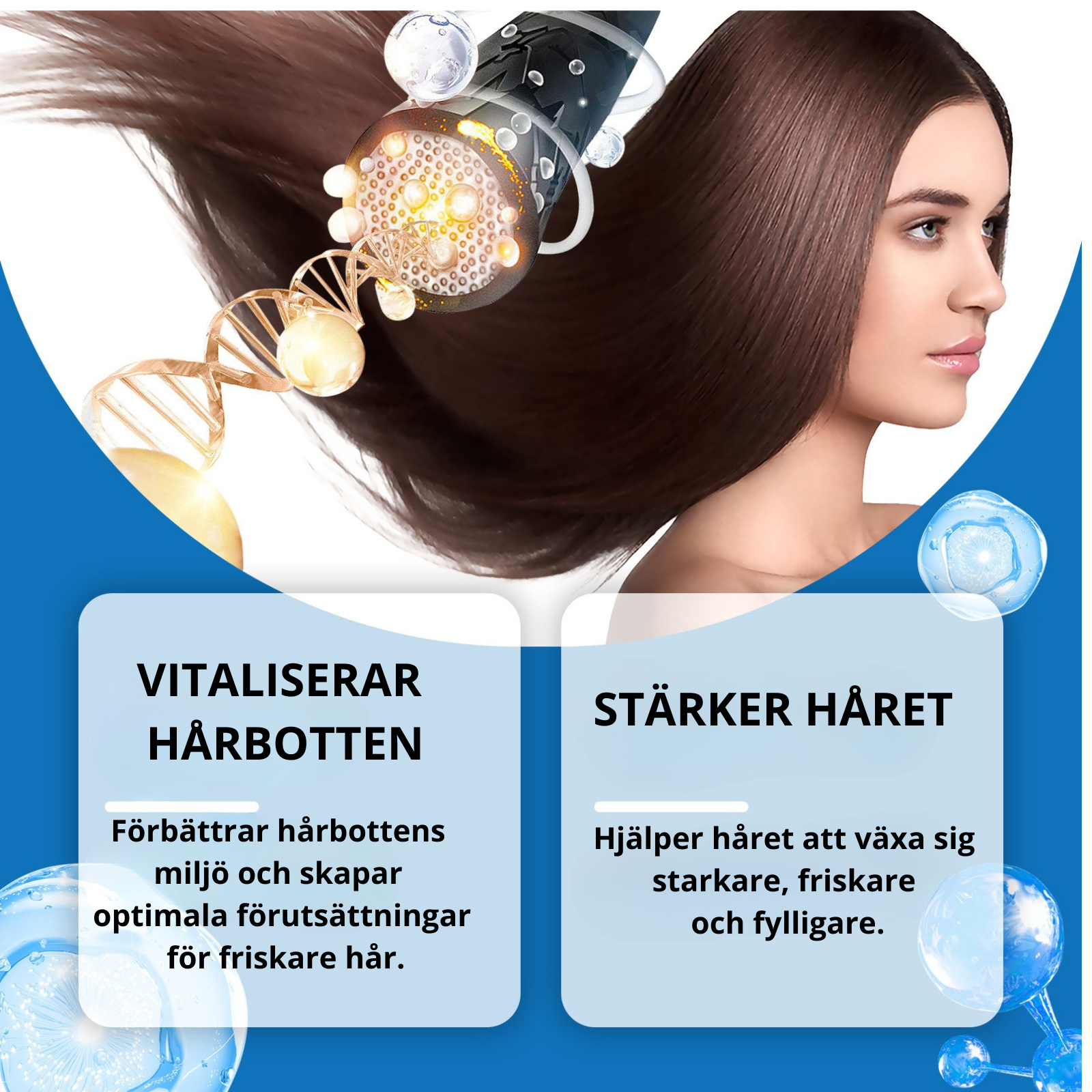Aktiverar hårrötterna, stärker hårbotten och kan bidra till att bromsa håravfall.